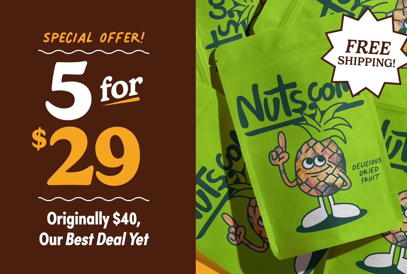 Try 5 of our juiciest dried fruits, from jumbo Dried Apricots to our signature medley of four premium raisin varieties. Let’s be clear: This isn’t any old fruit. We expertly source the biggest, most flavorful fruits from some of the most renowned growing regions in the world: pineapple from Thailand, apricots from Turkey, raisins from right here in the USA. With this box, you’ll taste the best of it all—always perfectly ripe, tender, and bursting with sweetness, never over-dried or dull like some of the stuff you find at the grocery store. The term “nature’s candy” will never feel more accurate.