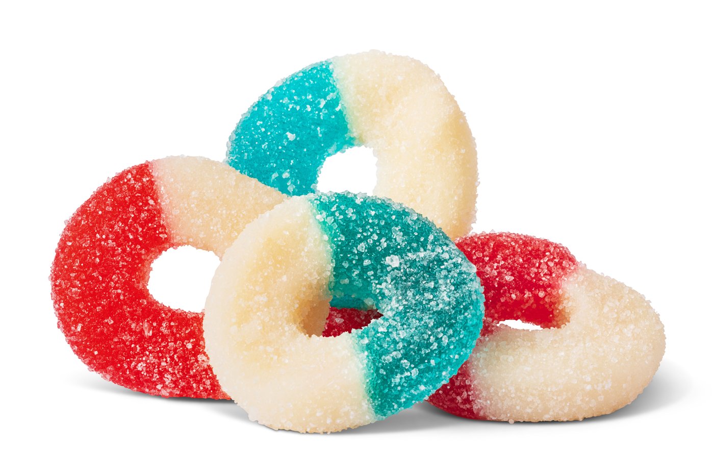 Fill up your summer candy bowl, and snack red, white, and blue with our festive gummy rings. Coated in a sour sugar dusting, each batch bursts with tart, tangy, sweetness, complemented by a soft and chewy texture. Every bag features two flavors, Cherry and Blue Raspberry. Available for a limited time only.