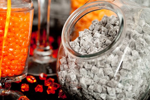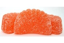 Candy weights (from upper left corner): (1) 7 lbs Diced Coconut; (2) 10 lbs White M&Ms (175 oz container); (3) 10 pieces Tangerine Candy Sticks; (4) 1 lb Twizzlers (Licorice) (125 oz container); (5) 5 lbs Orange Shimmer Gum Balls (140 oz container); (6) 3 lbs Candy Caviar (50 oz container); (7) 5 lbs Orange Fruit Slices (125 oz container); (8) 9 oz Orange Slices (200 oz container); (9) 10 pcs Orange Rock Candy Sticks (Unwrapped); (10) 6 lbs Gummy Peaches (225 oz container); (11) 3 lbs White Chocolate Chips (105 oz container); (12) 5 lbs Black Finnish Licorice (116 oz container); (13) 3 lbs Black Gum Balls (140 oz container); (14) 3 lbs Jelly Belly Tangerine (50 oz container); (15) 4 lbs Sugar-Free Creamsicle Chews (157 oz container); (16) 7 lbs Mochi Rice Cakes (Black Sesame) (170 oz container)