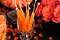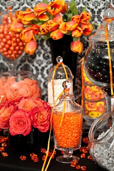 This orange and black candy buffet is elegant and sophisticated. The orange flowers add bursts of happy hues. Buffet tip: Consider the backdrop against which you set your buffet. The background (and table linens) can really add the wow factor to your buffet.